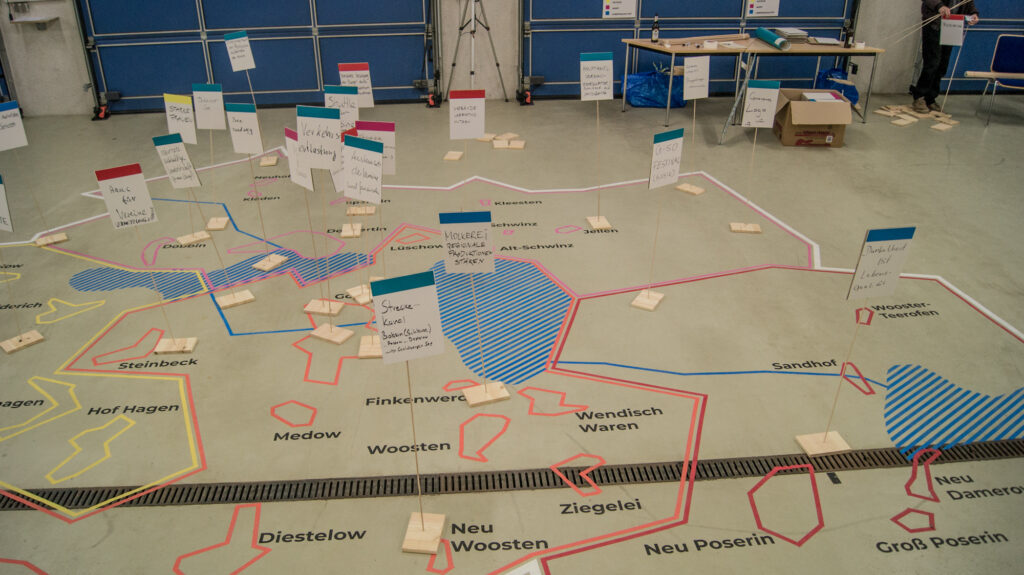 Dazu führt das Thünen-Institut in mehreren Etappen einen breiten, 36 Dörfer umfassenden Beteiligungsprozess durch. Die besondere Herausforderung ist dabei, den Prozess über den Zeitraum von 18 Monaten und einen Raum mit 36 Dörfern verteilt auf fünf Gemeinden in Bewegung zu bringen und lebendig zu halten. Zudem sollen alle Inhalte gemeinsam mit den Bürger*innen entwickelt werden. Aufgrund dieser Anforderungen werden gleich zwei Strukturen zur Mitwirkung aufgebaut. Die erste ist die recht bekannte Form der öffentlichen Zukunftswerkstätten. Hier werden gemeinsam mit den Bürger*innen in passenden Formaten Inhalte, Ziele, Projekte und Visionen für ihr Zukunftskonzept erarbeitet.